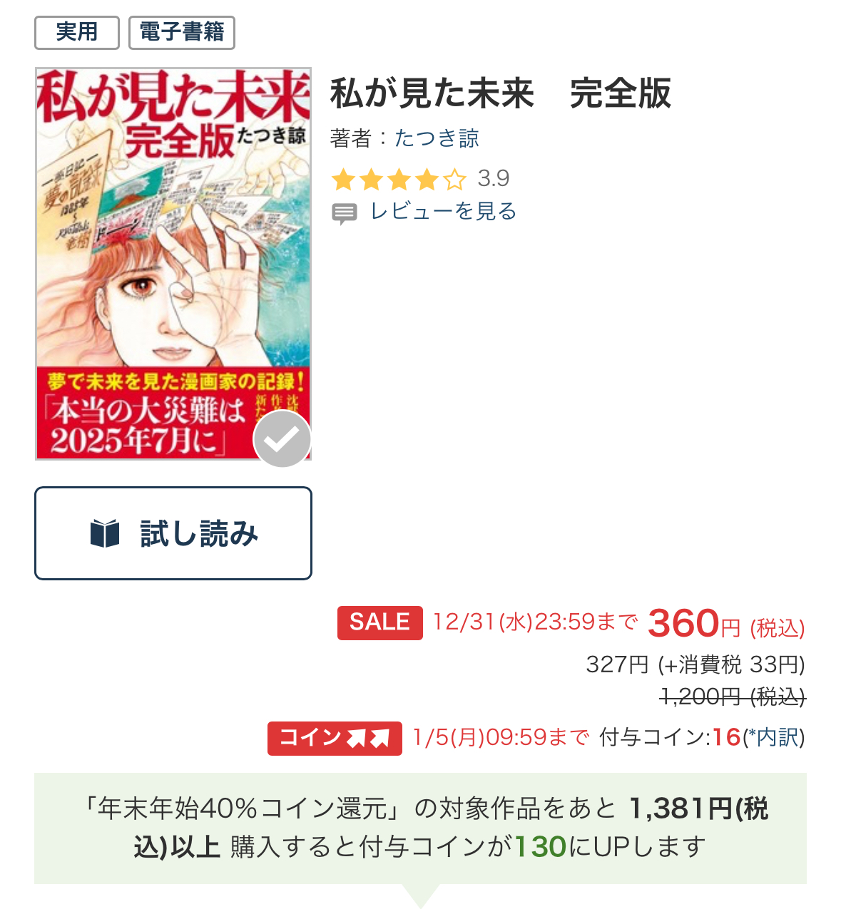 | … | 4425/12/29(月)00:03:00No.1387219564そうだねx2>※一部のミッションについて、ミッションの対象作品を550円(税込)以上購入した場合にミッションが達成となります。詳細は注意事項を必ずご確認ください。 |
