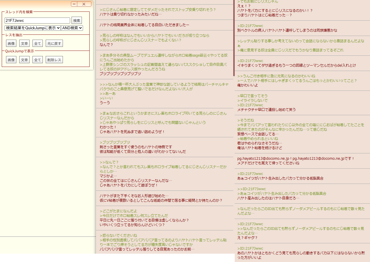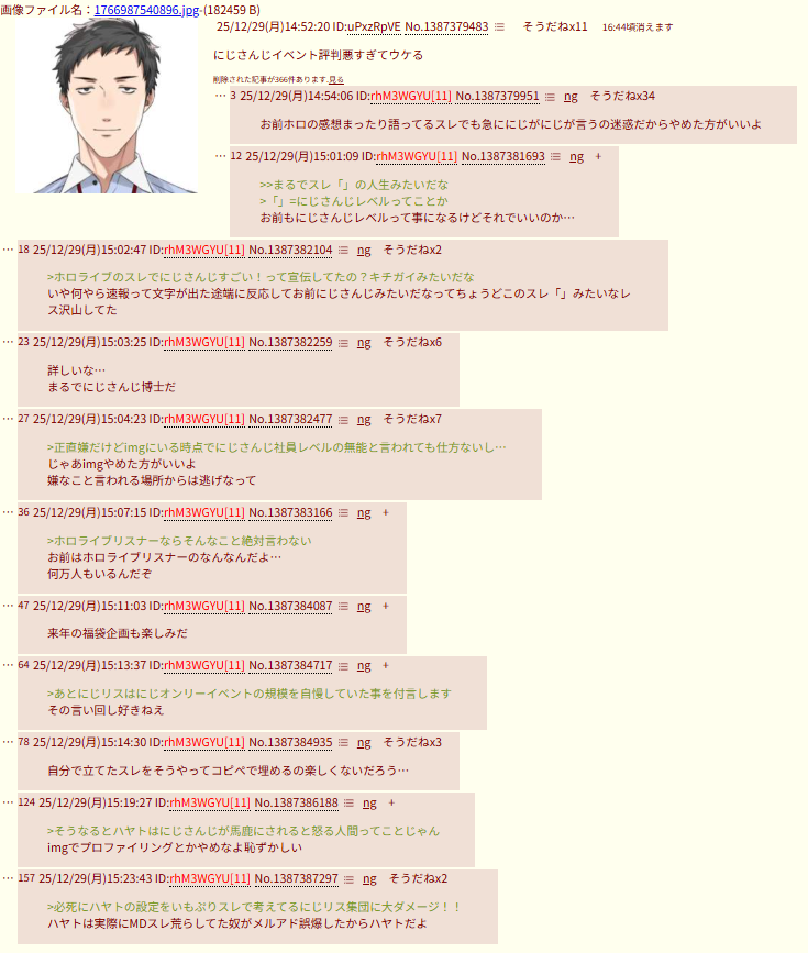 | … | 2925/12/29(月)16:50:43No.1387410239+>>>ホロ粘着に失敗したにじさんじリスナーが「にじ粘着」だなんだと拗ねながらコピペしたレスがなーされた |