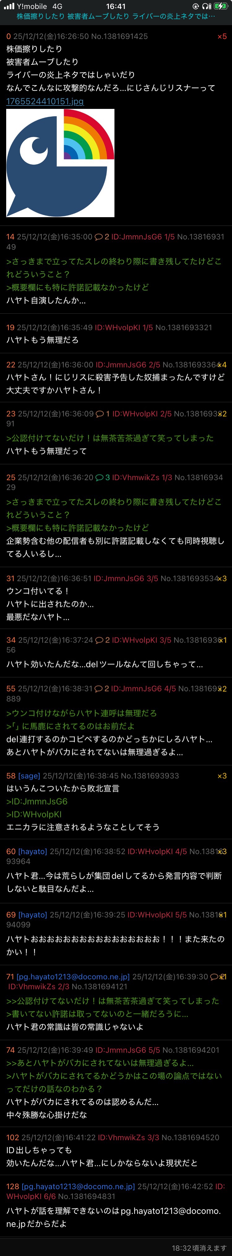 | … | 1725/12/29(月)16:46:01No.1387409067そうだねx20ホロ粘着に失敗したにじさんじリスナーが「にじ粘着」だなんだと拗ねながらコピペしたレスがなーされた |