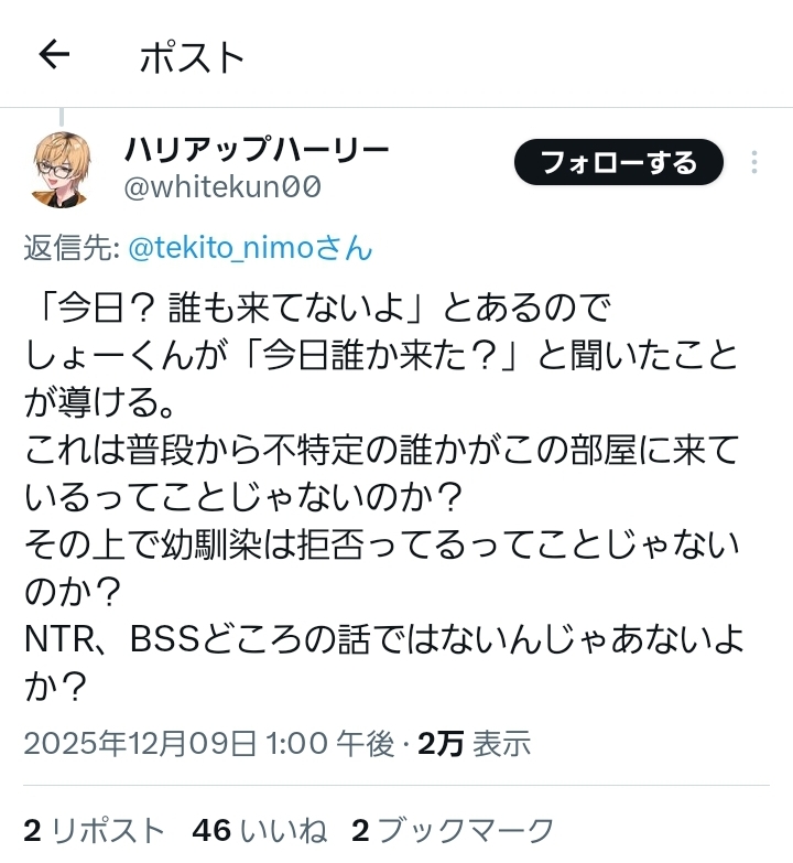 | … | 1825/12/29(月)16:48:10No.1387409592そうだねx5BSSでもNTRでもないのに脳が破壊されるっていうのがいい |