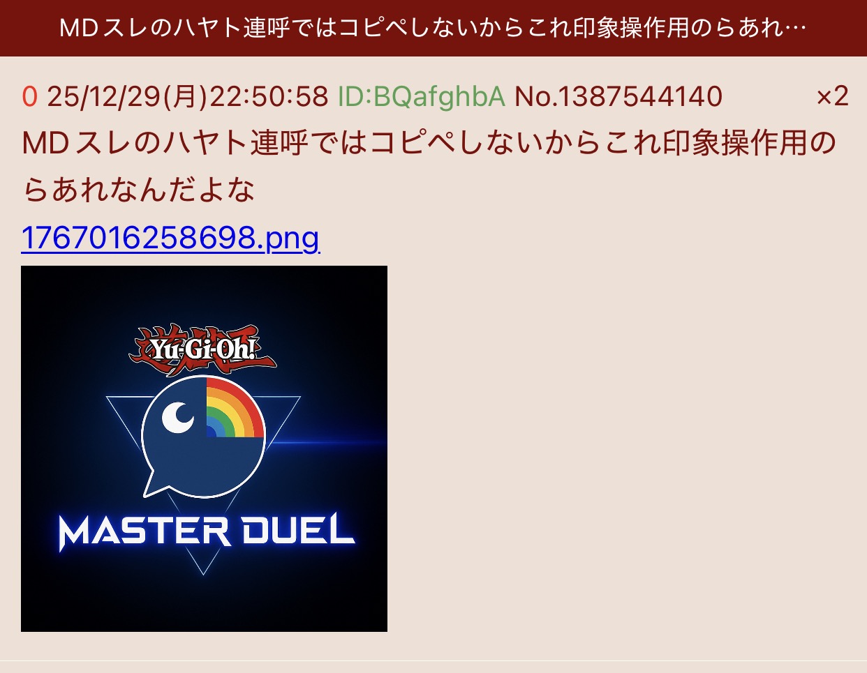 | … | 12025/12/30(火)10:30:31No.1387661182そうだねx3>まあこのMD粘着はにじ遊戯王祭の実況を荒せなかった腹いせだと思いますよ私は |