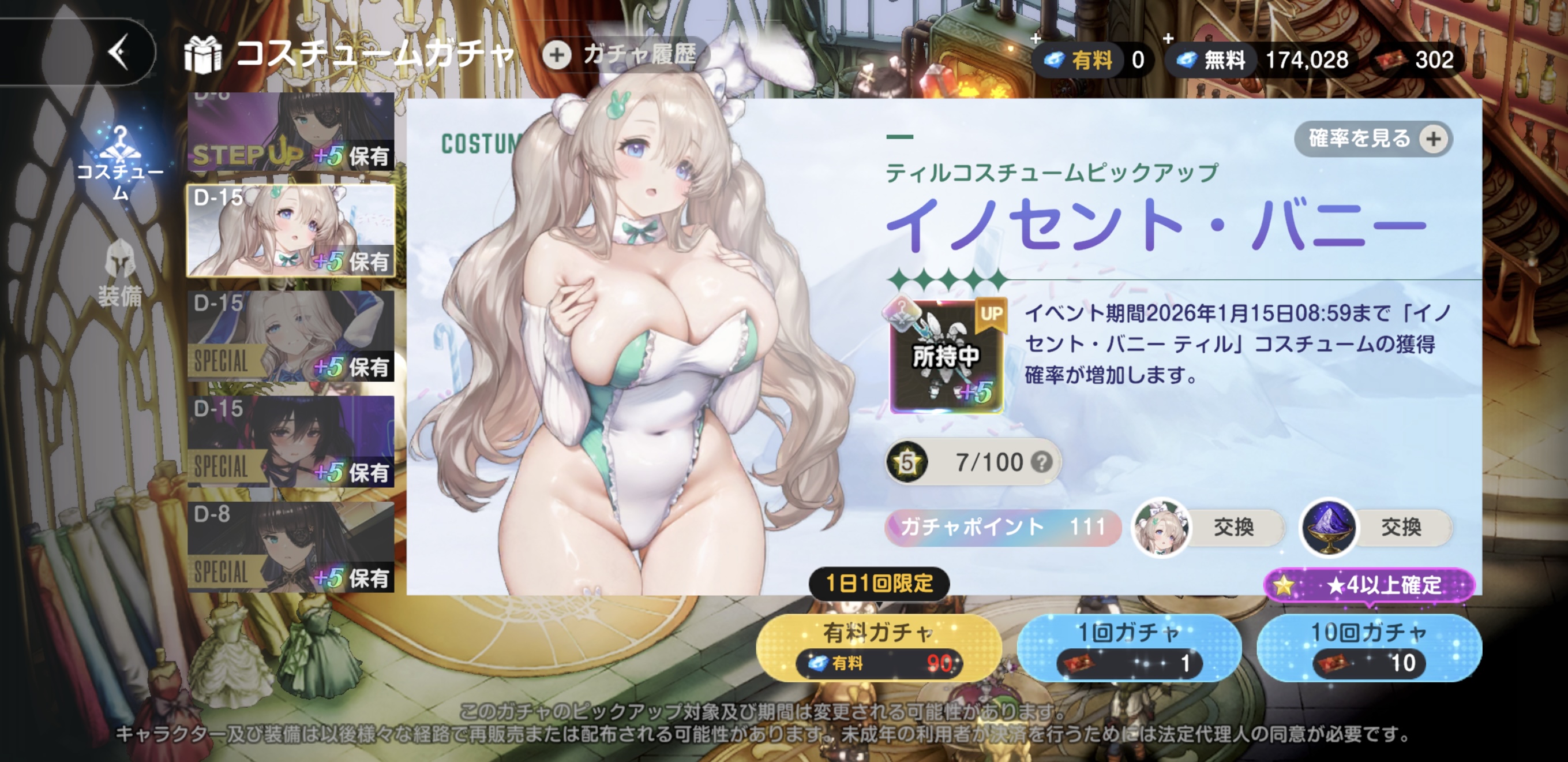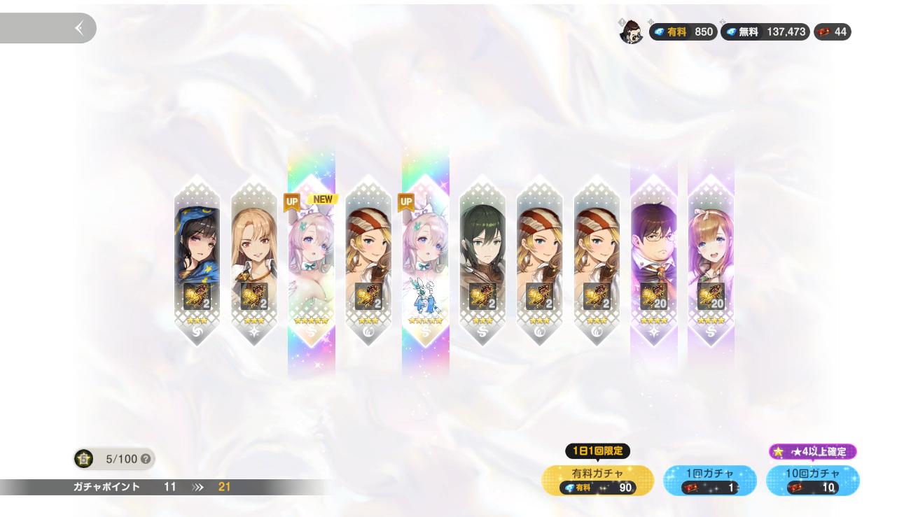 | … | 13325/12/30(火)15:18:24No.1387737081そうだねx1今回初のバニーガチャでステップアップガチャ引きつつガチャ券1300枚位で復刻バニー含めて全員+5と餅武器確保したい!って言ったけど有料パッケージ全部買ってたり無料ガチャ券配られすぎて途中1pickに400枚使いつつも900枚残しで開催中のは+4まで行けました…最終日まで無料で引けずに全部天井まで回しても+5は余裕だな! |