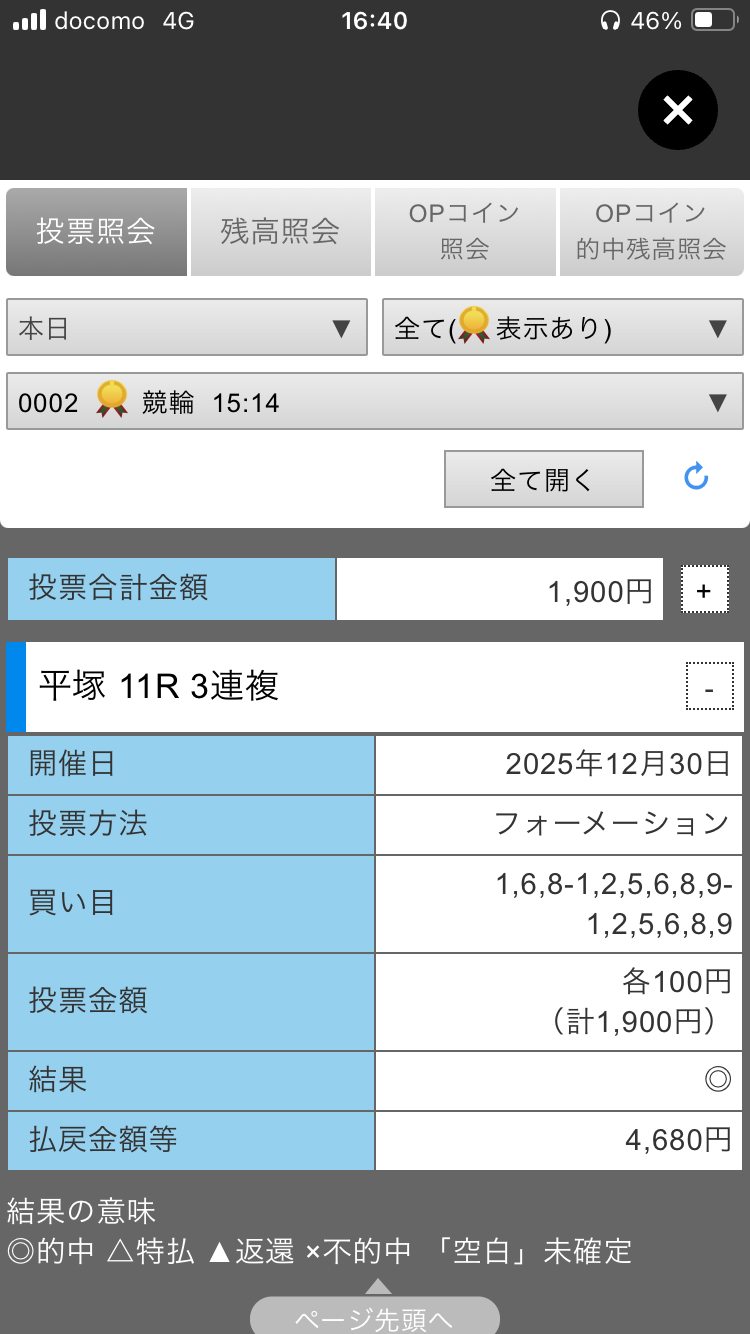 | … | 5225/12/30(火)16:33:43 ID:JJeoawbkNo.1387756031+ぐわー私の3-6-8の3連複1点勝負が……… |