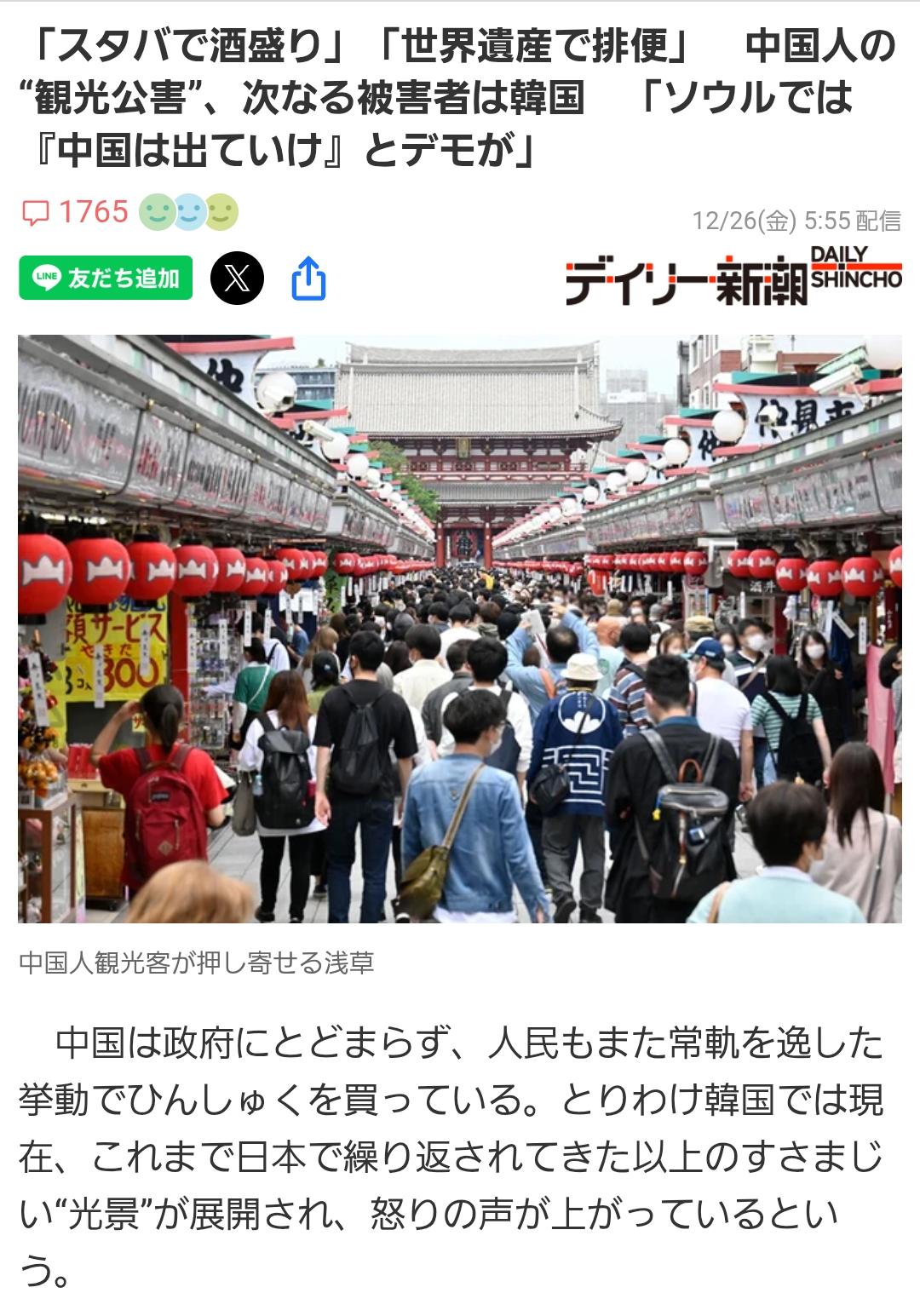 | … | 7825/12/31(水)09:48:17No.1387984376そうだねx4日本の観光地から中国人が減って中国以外の国から来てる訪日客が喜んでるのウケる |