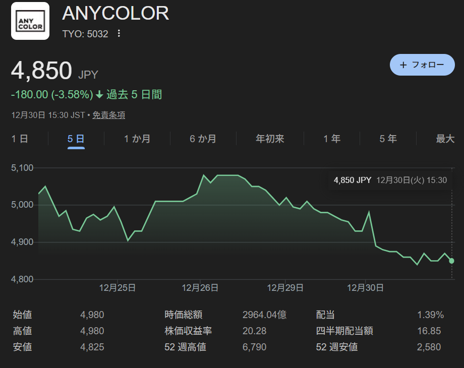 | … | 2025/12/31(水)09:44:22No.1387983448そうだねx11理屈はわからんけどにじリスが貢いだ金をエニーカラーが株価対策に使って株主に還元するとにじリスが喜ぶという現象は起きてるからそういうものとして扱うしかない |