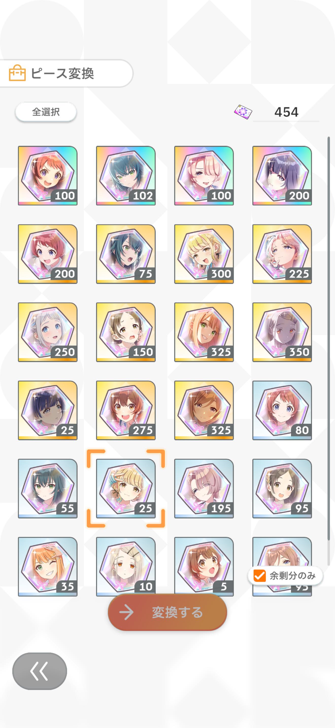 | … | 7725/12/31(水)09:59:53No.1387987065+>配信日からやってるのにピースをフラワーに交換出来るの今知りましたわ… >SR以下のピースとか全部交換しても良いもんなんですの? 一応凸回数ミッションはありますし光るものがあるSRもありますがフラワーが足りないなら砕くのも手ですわ |