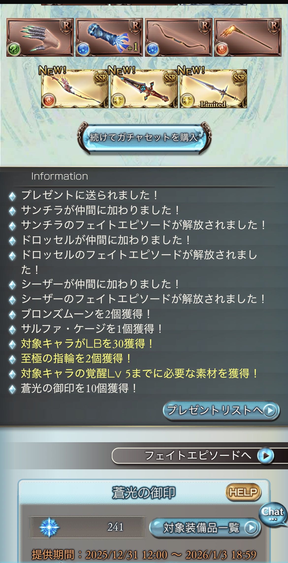 | … | 89925/12/31(水)12:19:04No.1388021909+とりあえず120連引いてサンチラひいたんだよ 後は明日以降の引きで決めるんだよ |