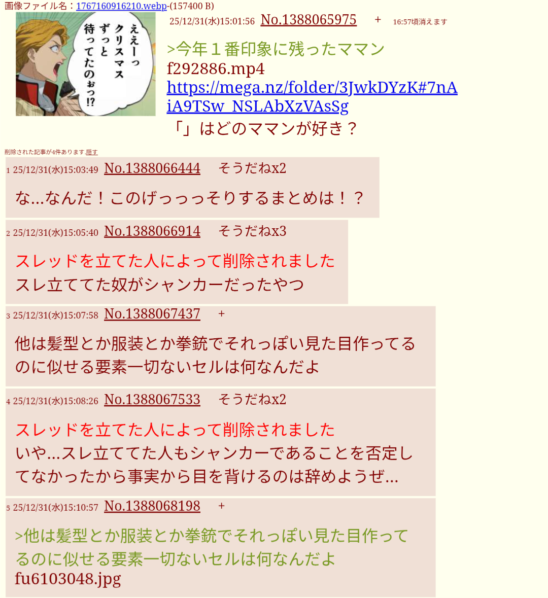 | … | 2525/12/31(水)15:41:25No.1388075835そうだねx3>ワンピネタで立てたけどシャンカーではありませんって事にして精神を守りたいんだろうけどスレ立てた奴がシャンカーって認めてたよ |