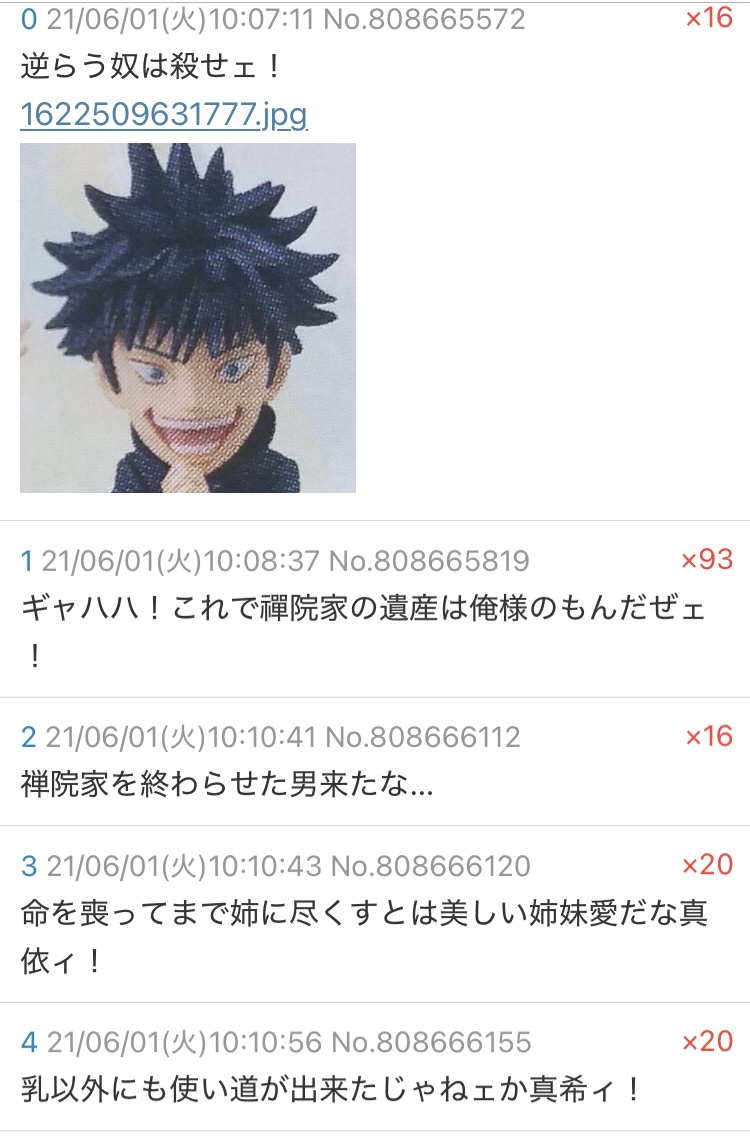 | … | 9325/12/31(水)19:15:30No.1388139540そうだねx2妹生きてる時の真希パイはマジで弱いからうn |