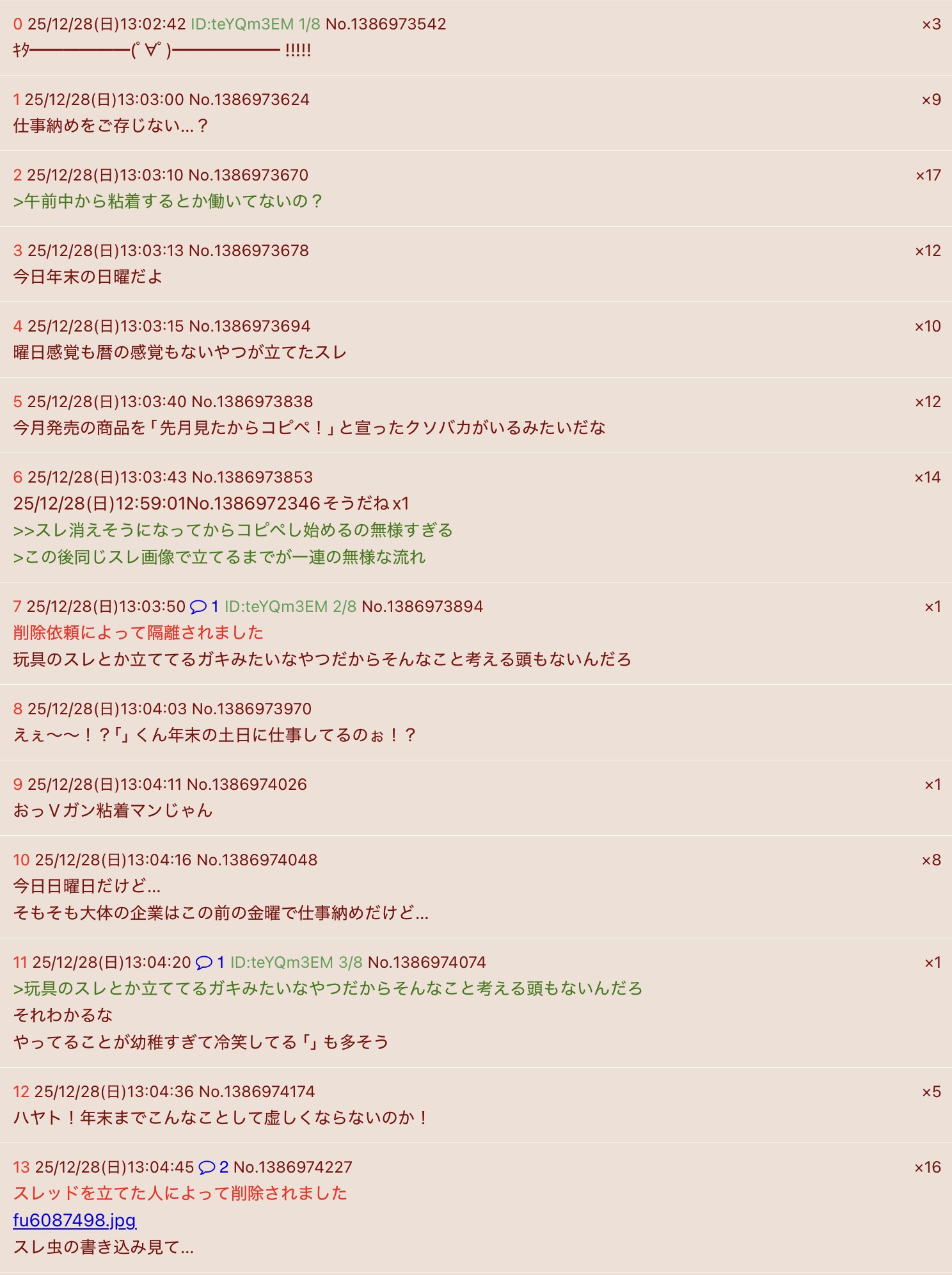 | … | 1325/12/31(水)19:53:51No.1388154704そうだねx1年末なのにクソみたいな擦りつけなんてくだらない事してんじゃねぇよ… |