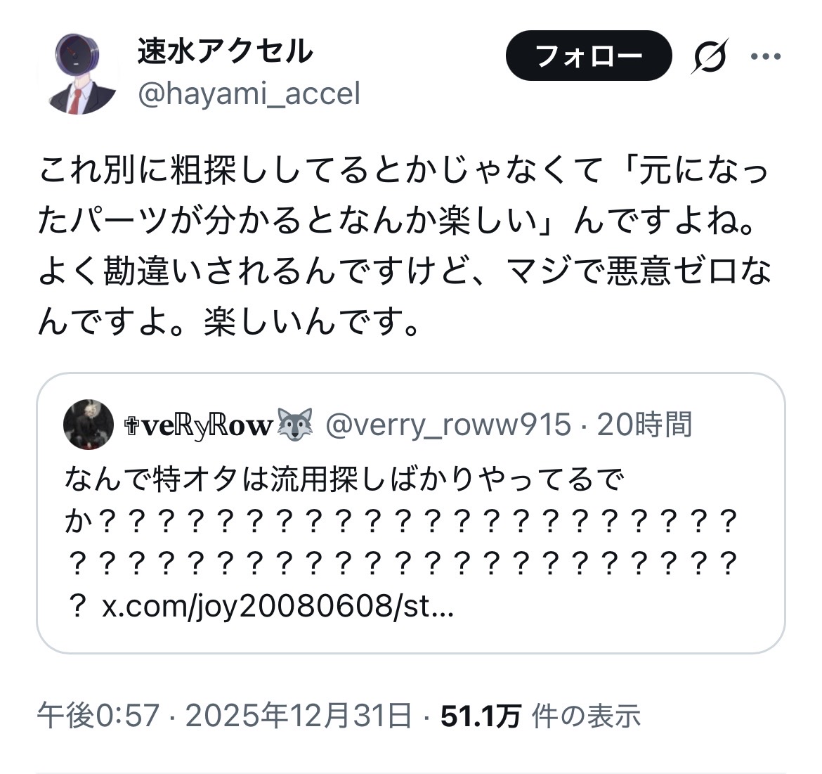 | … | 10125/12/31(水)19:59:23No.1388156843+大元のポストみたいに答えを持ってるわけない不特定多数に「結局これなんだったの?」みたいな問いかけ方してるのは火種撒いてんのかなってちょっと警戒しちゃう |