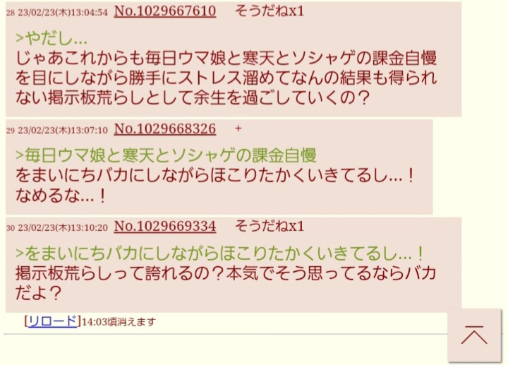 | … | 225/12/31(水)20:18:51No.1388165229+粘着アピールするスレ立ての目的とは? |