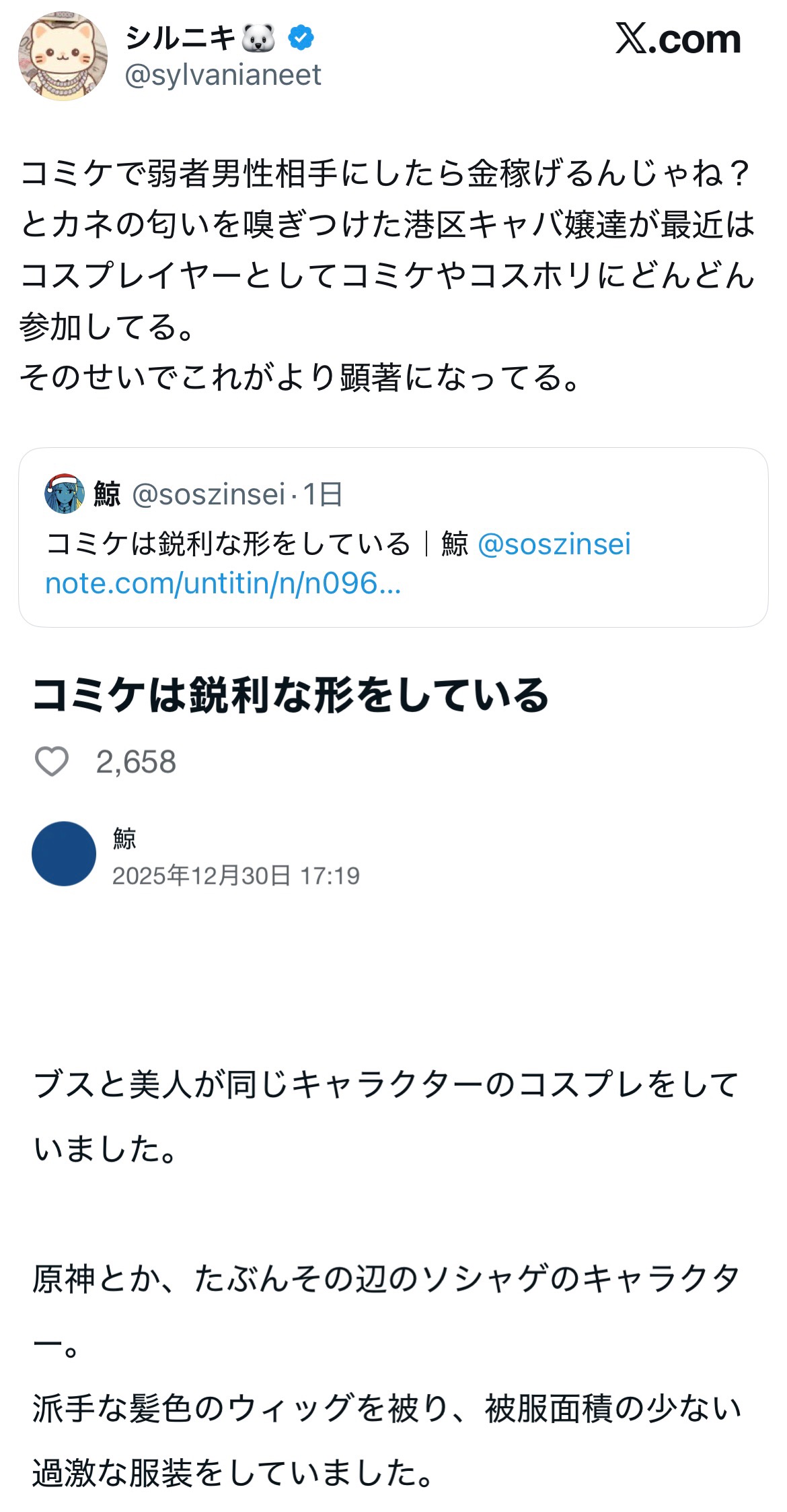 | … | 4925/12/31(水)20:57:02No.1388181326そうだねx2コスプレイヤーなんて元からチヤホヤされればなんでもいい売女しかいないんだから |