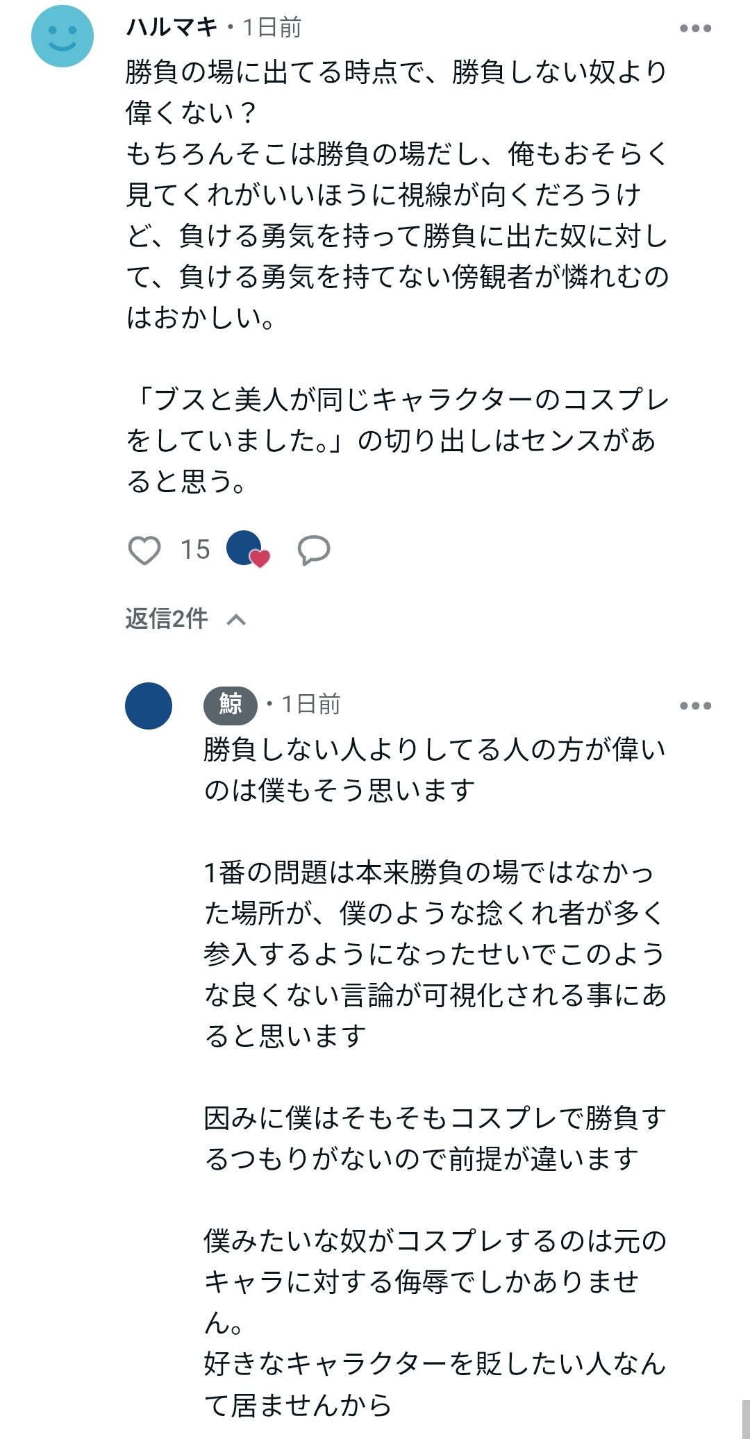 | … | 7825/12/31(水)21:00:56No.1388182852+>そもそもコスプレなんて自分のなりたい姿になるのが目的で |