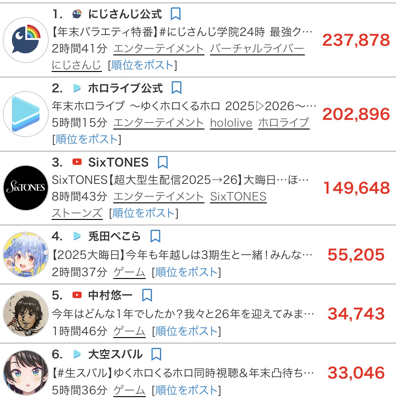 | … | 25825/12/31(水)23:29:26No.1388263398そうだねx4ていうか年末年始の配信なんて特殊な状況すぎてこれで何かを測れるようなもんじゃなくね? |