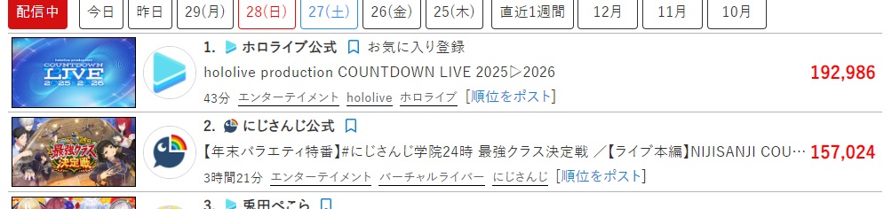 | … | 26325/12/31(水)23:30:32No.1388264152そうだねx5>ていうか年末年始の配信なんて特殊な状況すぎてこれで何かを測れるようなもんじゃなくね? |