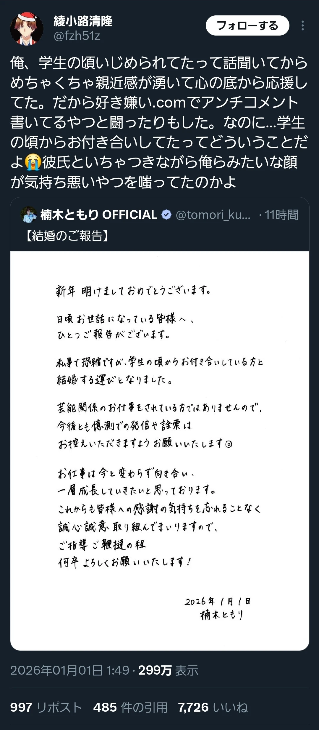 | … | 826/01/02(金)01:13:32No.1388648069そうだねx1最近は声優の結婚にキレてお気持ちしてる人よりも |