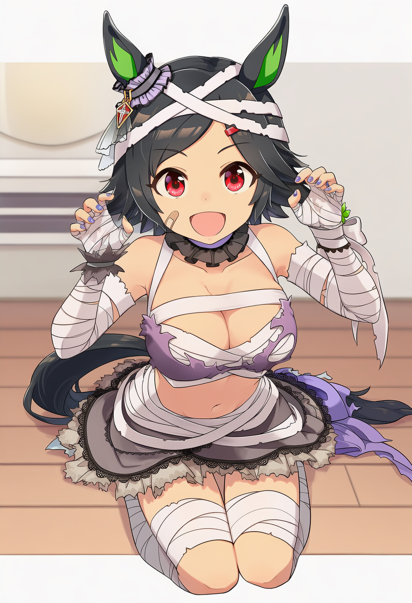 | … | 9626/01/02(金)06:32:49No.1388674866+>普通にキャラ出してるプロンプトにsuper creek (chiffon ribbon mummy) (umamusume) (cosplay),付け足すだけで出るよ |