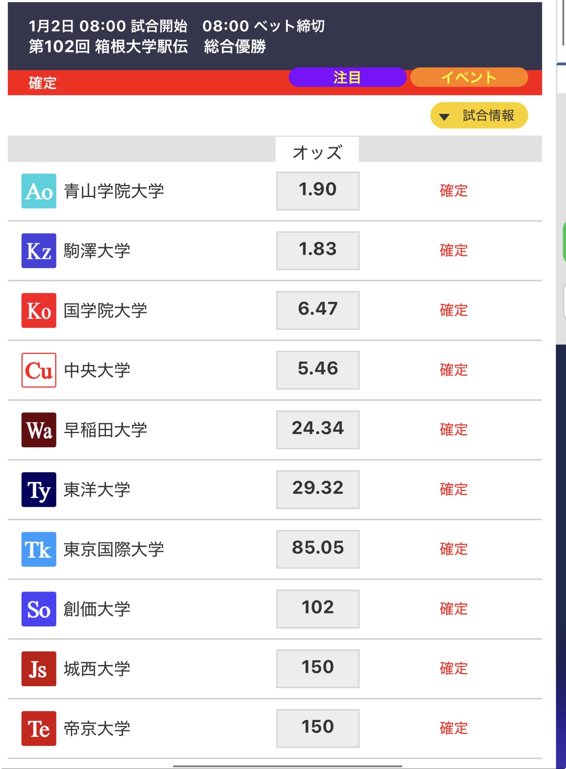 | … | 57026/01/02(金)10:59:45No.1388709545+>>昨日見たときは青学オッズ1倍台だったんですが今2−3倍台ですね |