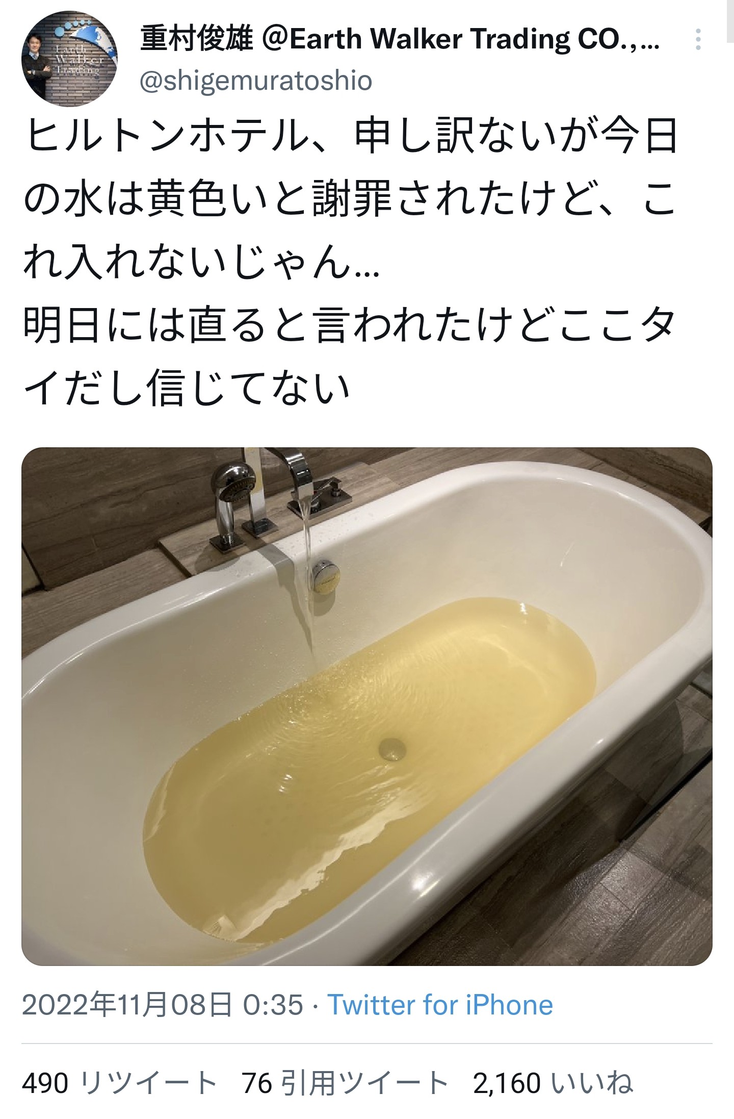 | … | 6226/01/02(金)12:38:18No.1388732146そうだねx1>ヒルトンであっても水道の専門家じゃないから結局民間の浄水機に頼るから浄水機だめになるとこうなる |