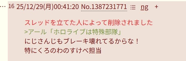 | … | 9626/01/02(金)15:20:15No.1388774665そうだねx1>もうコピペでスレ潰しできないからにじさんじでなんかあるとハヤト連呼するしかないのか… |