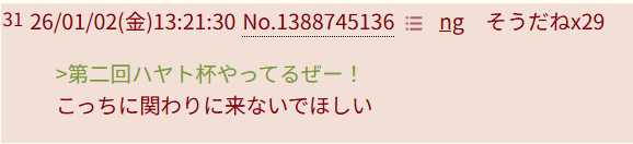 | … | 726/01/02(金)14:40:05No.1388765699そうだねx13>新年だぞハヤト発狂してる場合か |