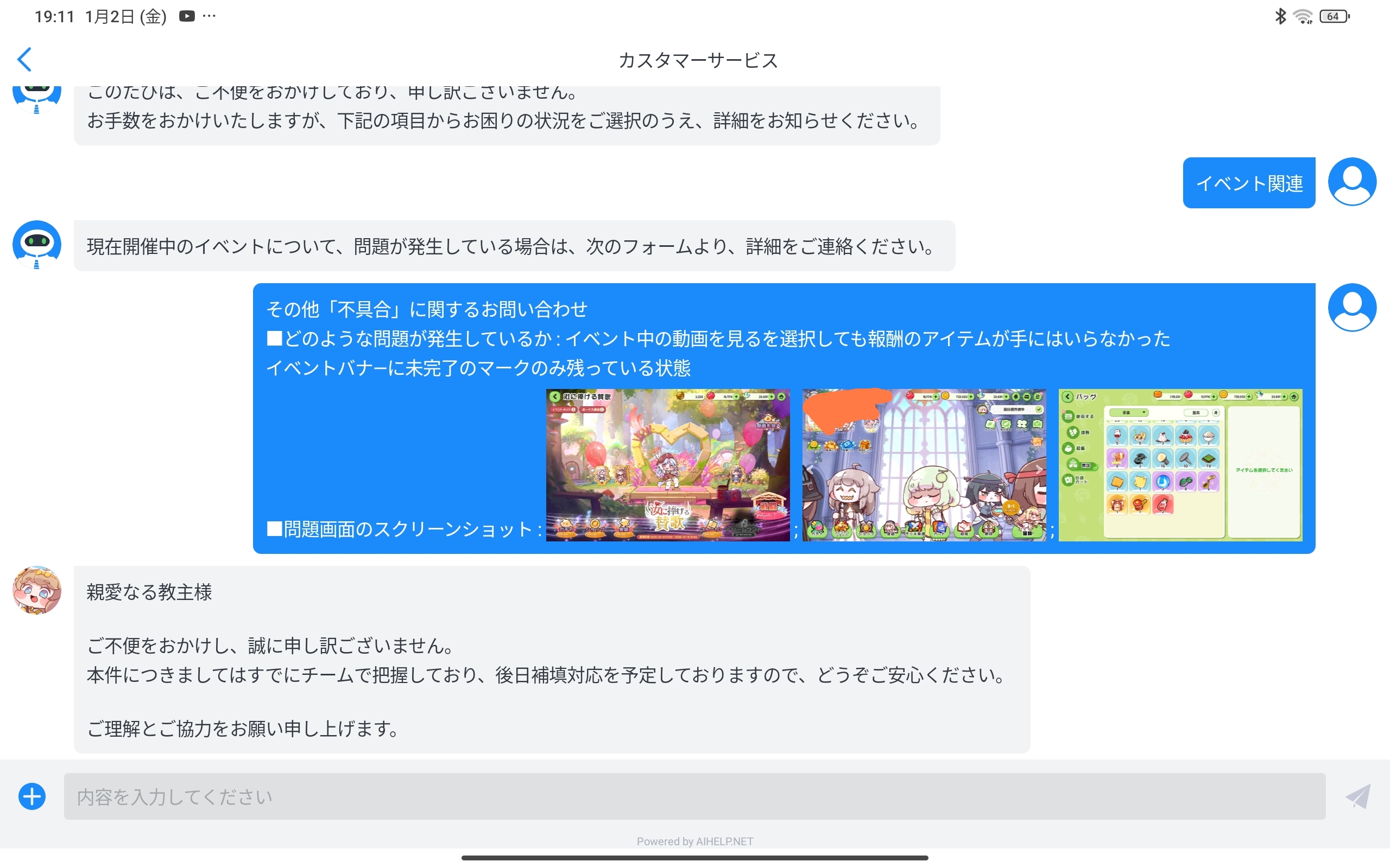 | … | 45126/01/02(金)19:25:28 ID:gDxP494.No.1388841489そうだねx1本件につきましてはすでにチームで把握しており、後日補填対応を予定しておりますので、どうぞご安心ください! |