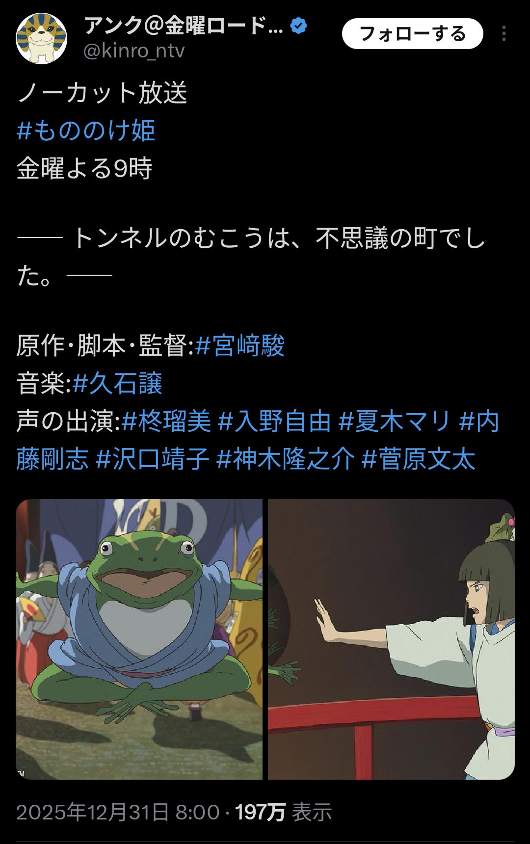 金ローで千と千尋の神隠しやるよ上限1000レスに達しました