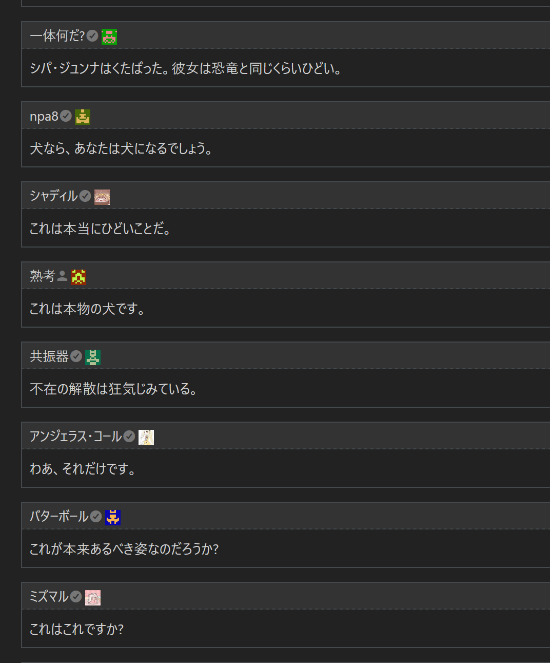 | … | 30226/01/03(土)00:55:02 ID:jzT1D6r6No.1388965448+>プレイヤーのアバターというには教主ちゃんが割と困ったやつにゃん… |