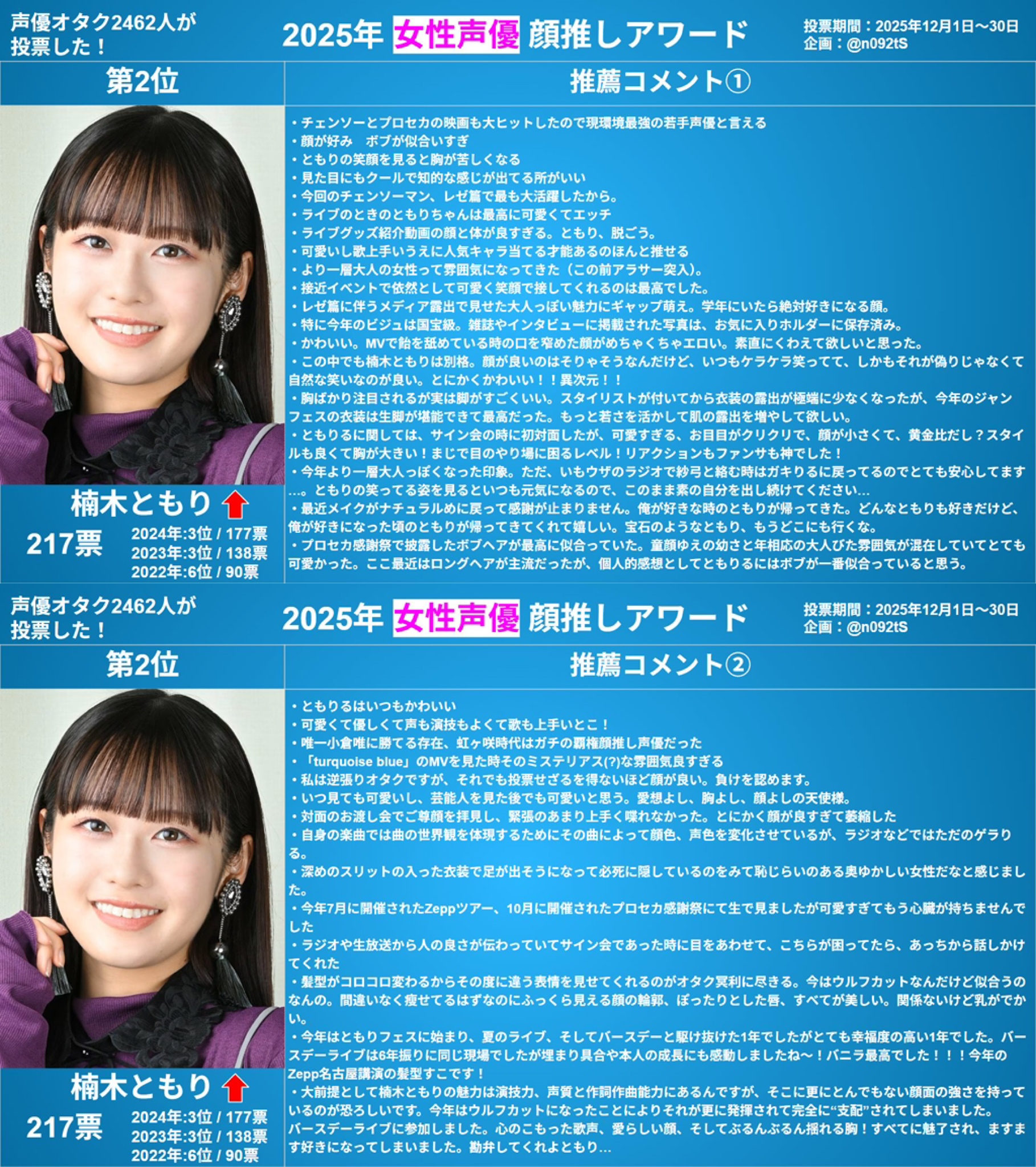 | … | 8826/01/03(土)07:11:43No.1389001035+作品の事を語ってくれてる時は好感持てたりするけど基本的に所詮ただの声帯としか捉えてないからここまで熱中出来るのを羨ましくもある |
