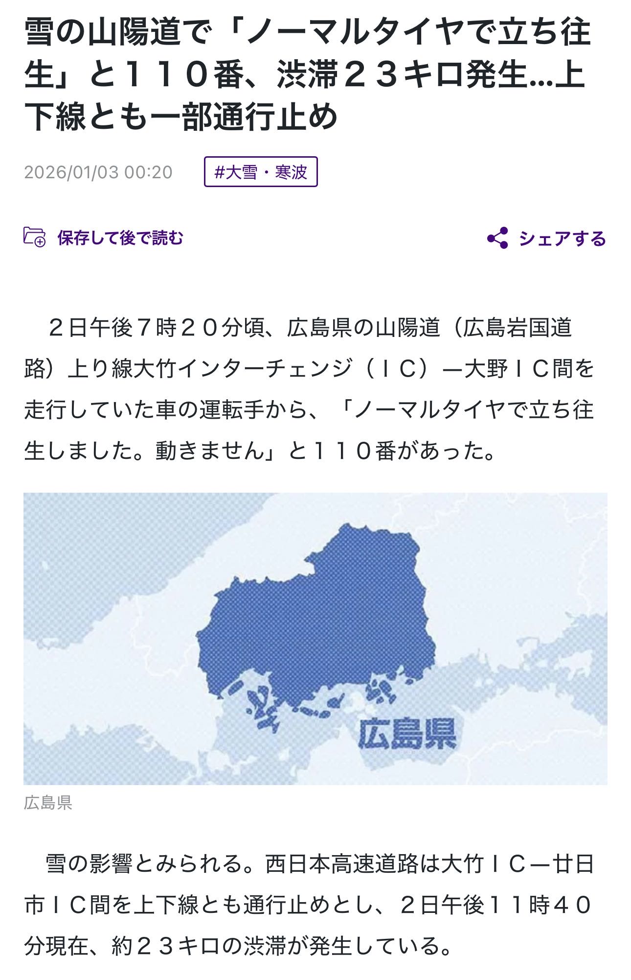| … | 7626/01/03(土)09:34:22No.1389017994+昨日大竹あたりはチェーン規制が出てたけど検問してる訳じゃないからノーマルタイヤの車が結構いるんだろうな |