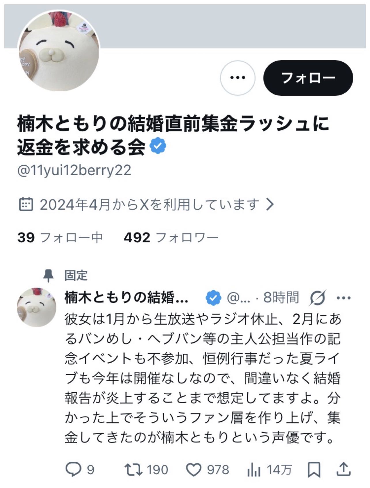 | … | 60826/01/03(土)12:36:08No.1389059031+学生時代からの彼氏となると、デビュー当時にはすでに将来を誓った相手がいたということになります。“他人の彼女”を応援していたということにショックを受ける人たちがいるようですね。実際、女性声優は近年ではアイドル視される傾向が強く、結婚や熱愛が発覚すると露骨に人気が下がる傾向にあります。楠木さんもその点では今後苦戦するかもしれません |