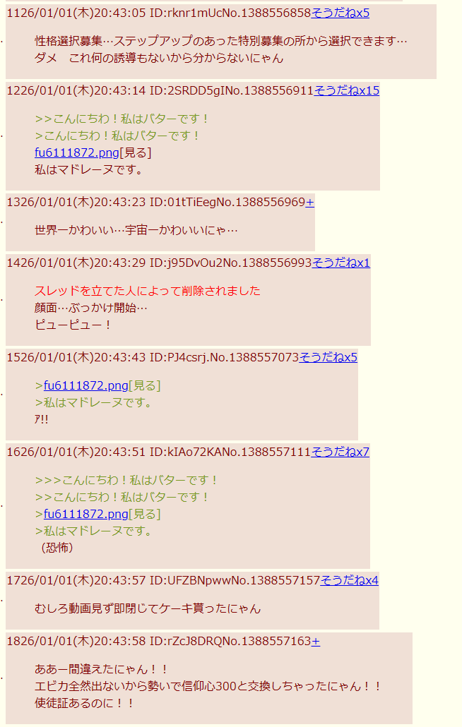 | … | 1426/01/03(土)14:40:36 ID:iPgzviyYNo.1389091880+>マドレーヌ |