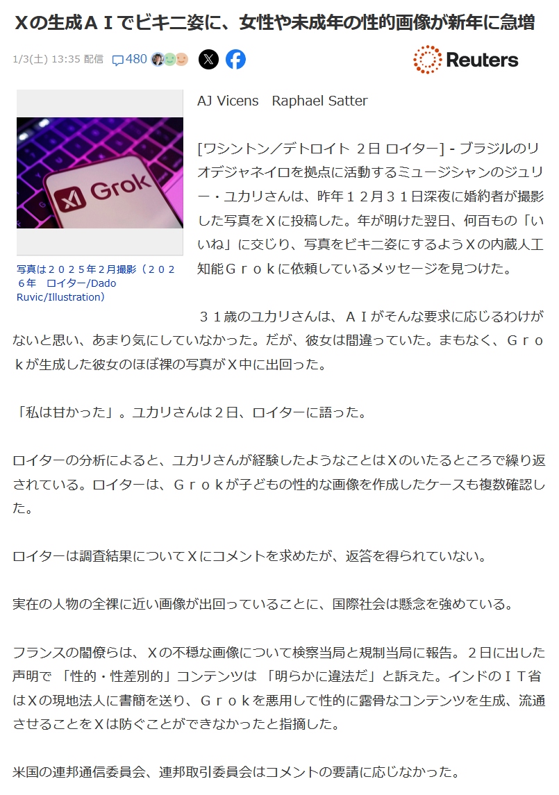 | … | 3926/01/03(土)19:08:10No.1389161897+ソーシャルメディア「X」を所有する米実業家イーロン・マスク氏が率いる人工知能(AI)企業「xAI」の生成AIチャットボット「Grok」に、自分の写真から着ている服を消された女性が、「人間性を奪われ、性的ステレオタイプに落とし込まれたと感じる」とBBCに話した。 |