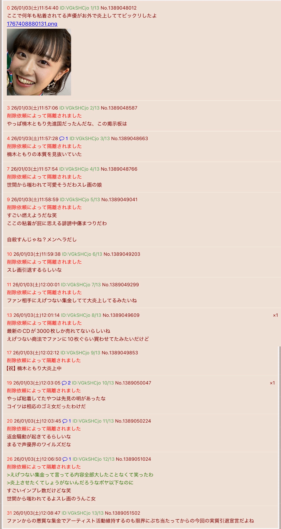 | … | 9026/01/04(日)05:51:48No.1389324544+ついさっき見てたスレでも荒らしいたぞ |