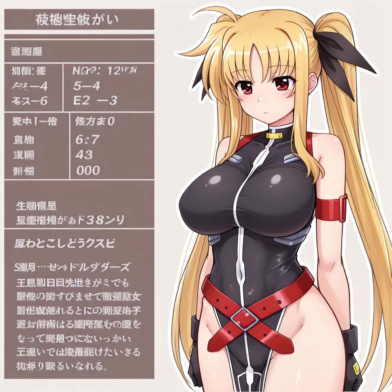 | … | 2026/01/04(日)20:38:38No.1389522765+>画像の左側のステータスウィンドウのみを、「魔法少女リリカルなのは」の登場人物「フェイト・テスタロッサ」がアダルトゲームの世界で性に奔放に活動した際のエロステータスに書き換えてください |