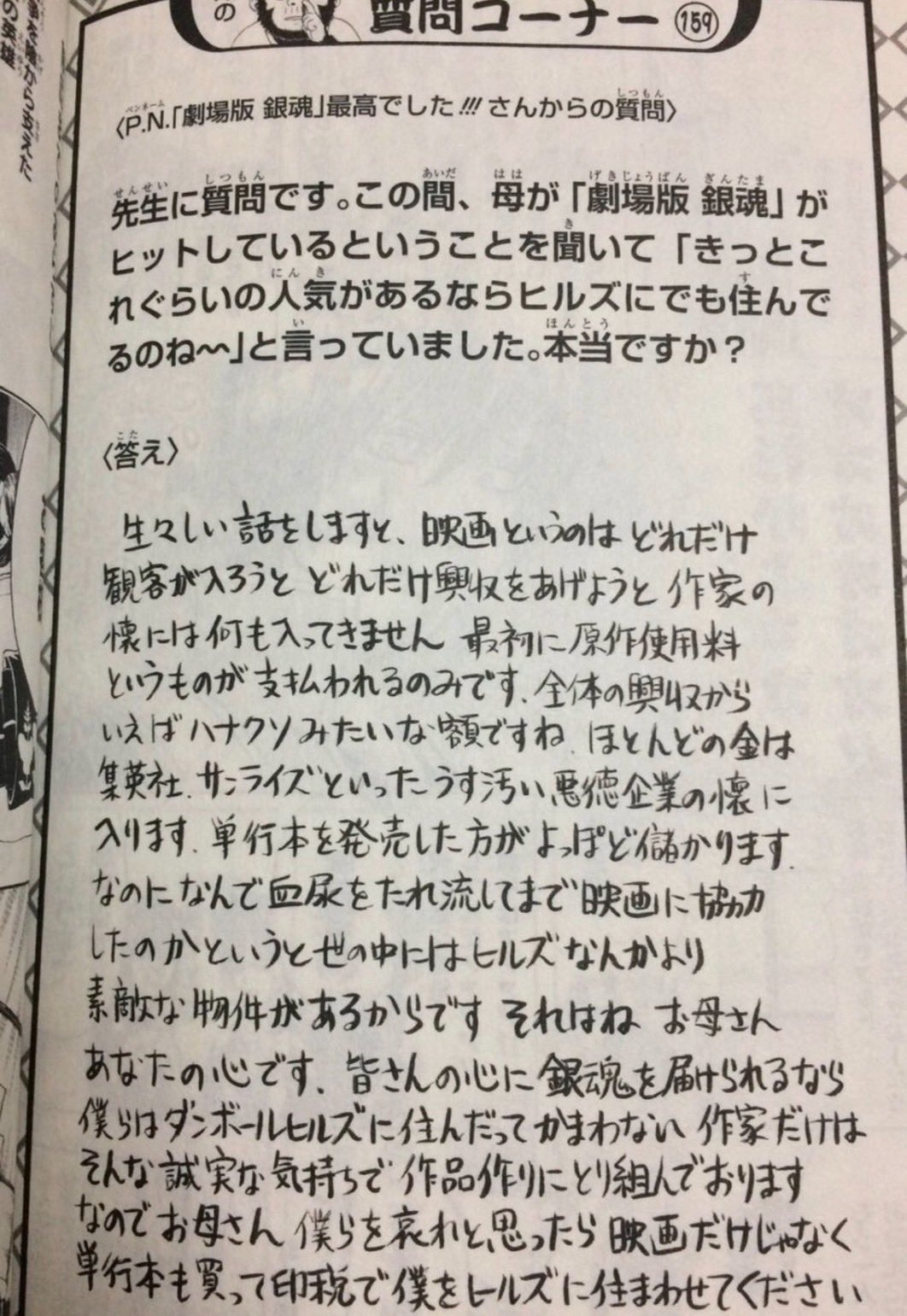 | … | 6526/01/04(日)22:47:48No.1389574893そうだねx2実際のところ映画抜きでも一生分は稼いでるだろ空知は |