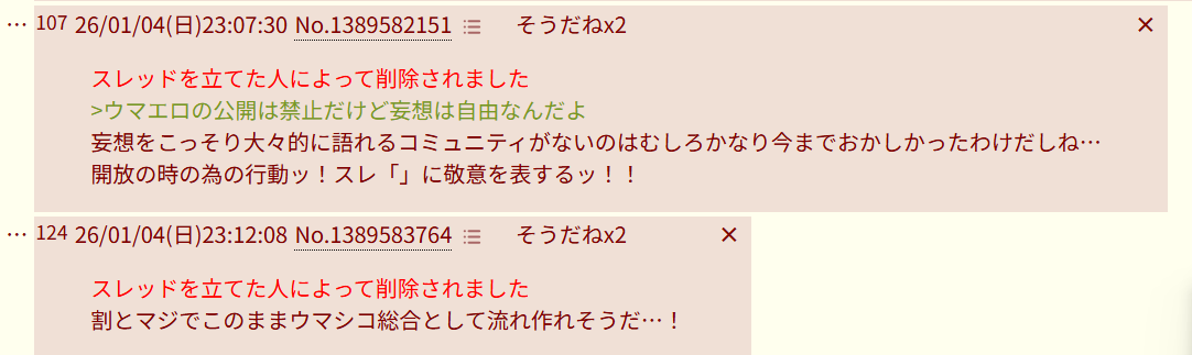 | … | 2026/01/04(日)23:48:06No.1389596295そうだねx4スレッドを立てた人によって削除されました |