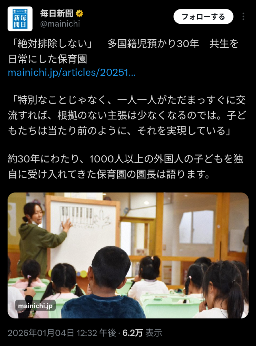 | … | 5826/01/04(日)23:52:54No.1389597862そうだねx4>>この幼稚園“は”外国人排除してないよと言う事で |