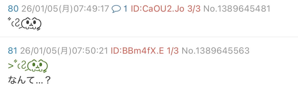 | … | 23026/01/05(月)09:11:16 ID:3sEpsqJ.No.1389654012+>(´・✖︎・` ) |