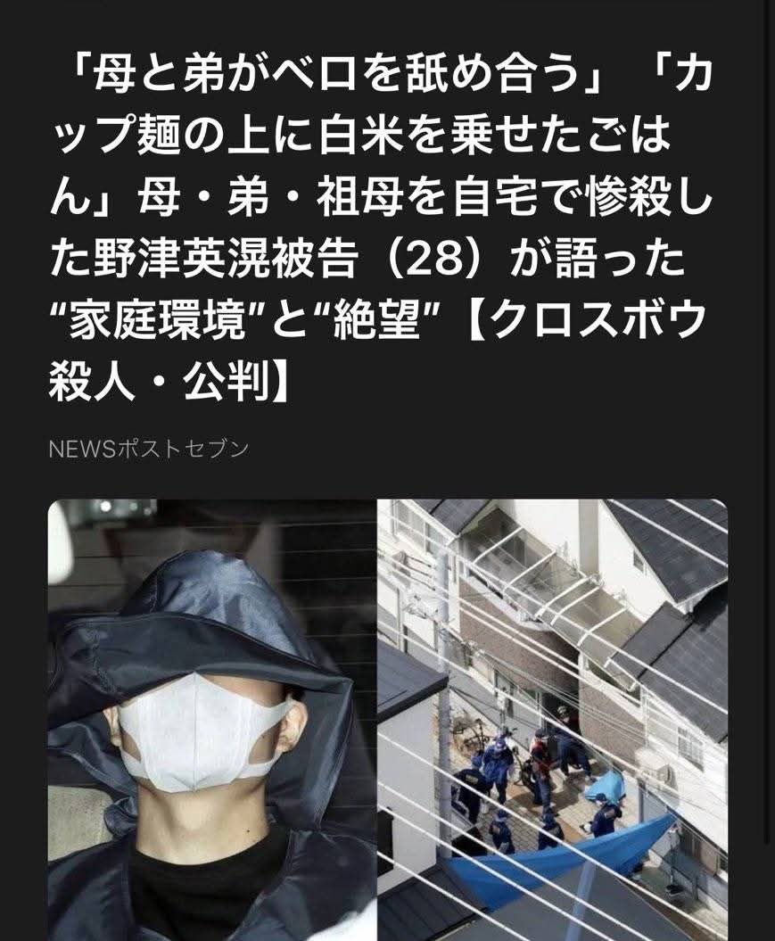 | … | 10426/01/05(月)18:47:41No.1389765600+>大学の授業で、3人の殺害でも減軽され死刑にならないかもと聞いた。叔母も血のつながる一族として、清算の対象とした。4人殺せば死刑になると思った。 |