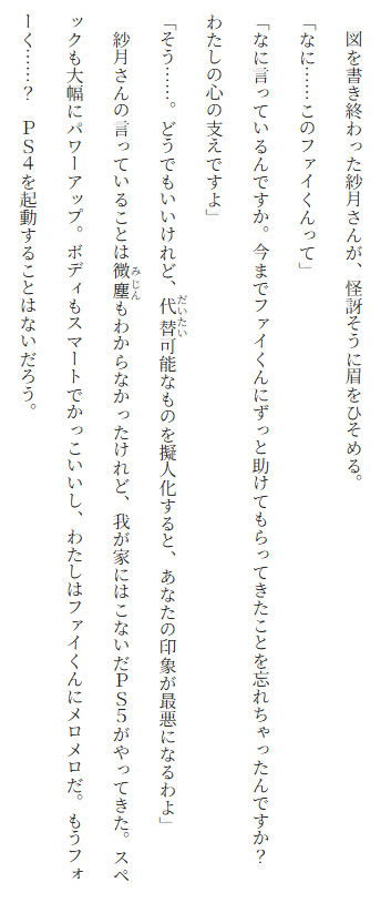 | … | 10926/01/05(月)21:37:46No.1389828402+2巻でれな子はPC版の性能MAXで遊ぶことは学生ゲーマーの夢なんだフヒヒって語って紗月さんにドン引かれてたから4からスペックアップしたファイくんへの高鳴りは相当なものだったろう |
