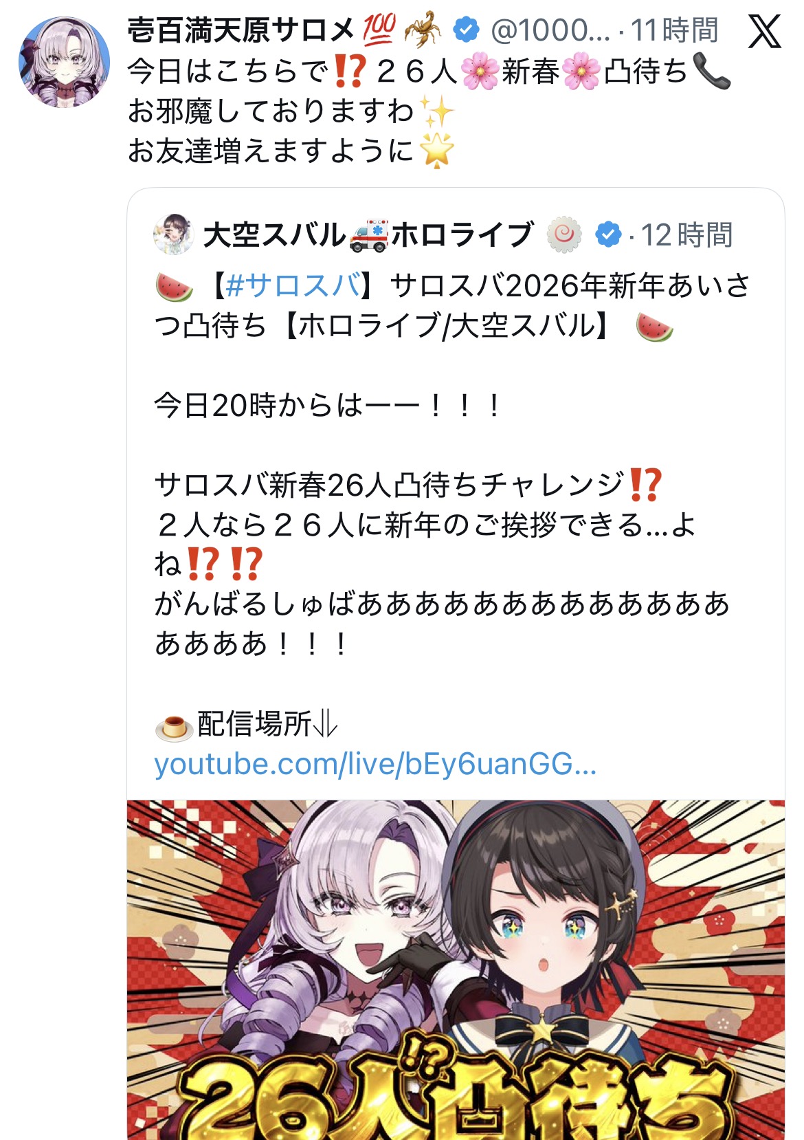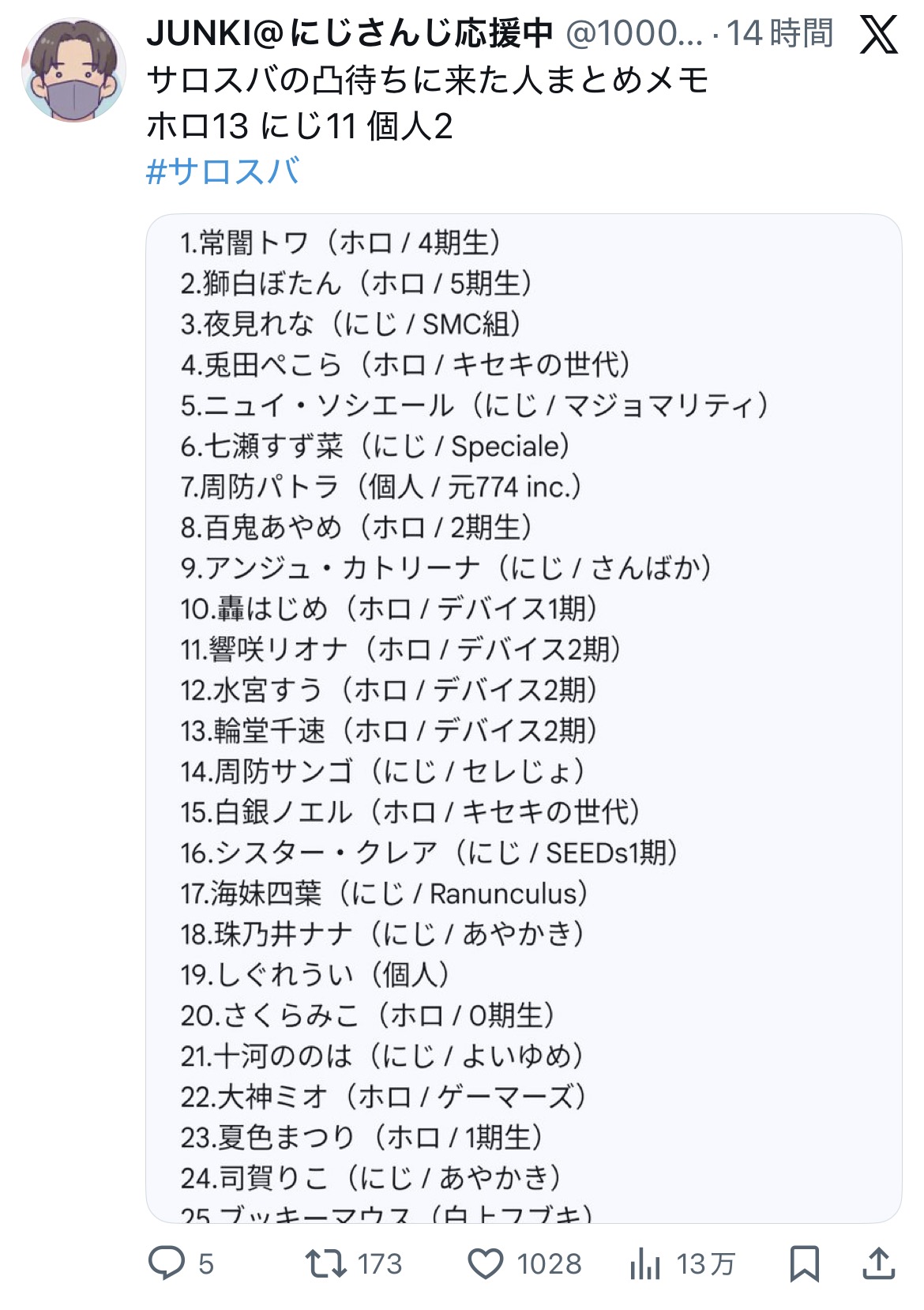 | … | 12026/01/06(火)15:00:39No.1390000298+>因みにこれは昨日のホロや個人は面識ある相手しか来てないのににじ側からはサロメにすら面識のないやつが来まくった凸待ち参加者 |