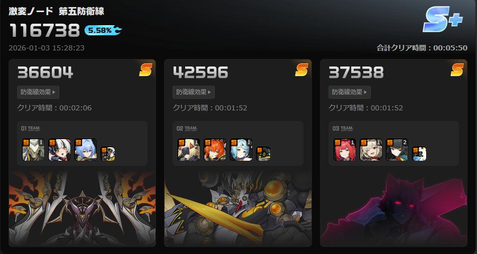 | … | 85026/01/06(火)22:26:05No.1390125709+>異常耐性とブレイク有利のボスが出たから雅よりエレンの方がスコア出ることも増えてきたンナ |