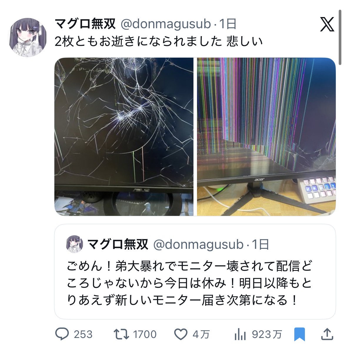 | … | 8426/01/06(火)22:54:43No.1390135728+それで何で兄貴のモニターが割られるのか意味分からないぞ |