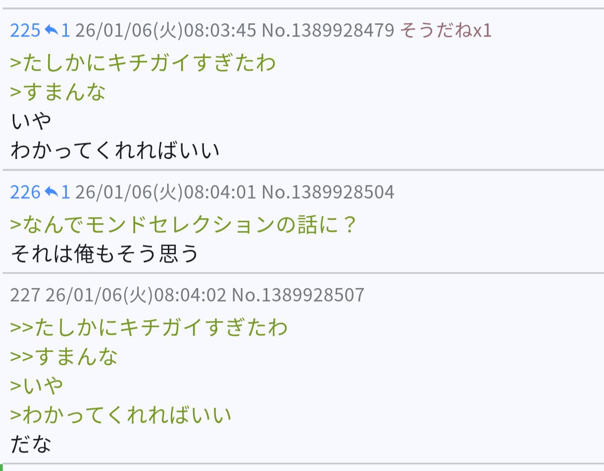 | … | 22426/01/06(火)23:19:58No.1390144375そうだねx2たまに平日昼間にここ覗くとダル絡みしてウケていると勘違いしている子とか病気の人とかいるよね |