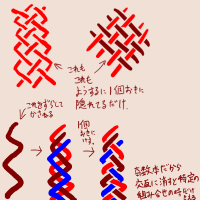 | … | 12126/01/07(水)06:01:22No.1390192992+編むのって常に交互に1本隠れる構造って理解すると 3本の場合ぱっと見で見えてるのが2本だけになるってわかる 4本の場合3本に見えるようになる |