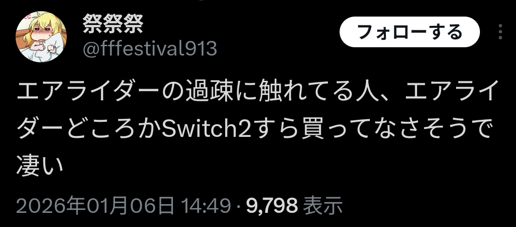 | … | 1126/01/07(水)09:36:37No.1390210388そうだねx2>エアライドは友達同士で集まって騒ぎながらやるものだから |