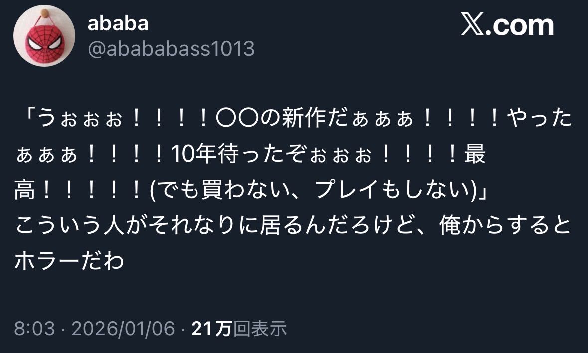 | … | 2026/01/07(水)12:40:18No.1390243733+ゲームをやってはしゃぎたいってより発表だけ見てはしゃぎたい人は少なからずいると思う |