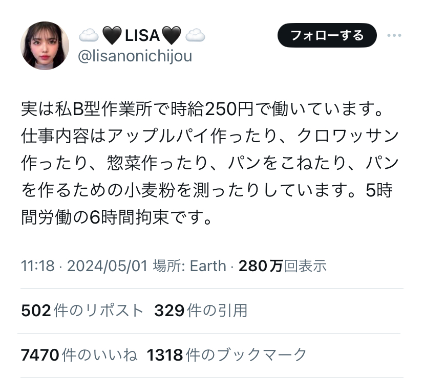 | … | 4226/01/07(水)17:00:51No.1390296753+作業内容的にB型でも上の方でゆくゆくはA型なり一般就労につなげるとこまで目的っぽいな |
